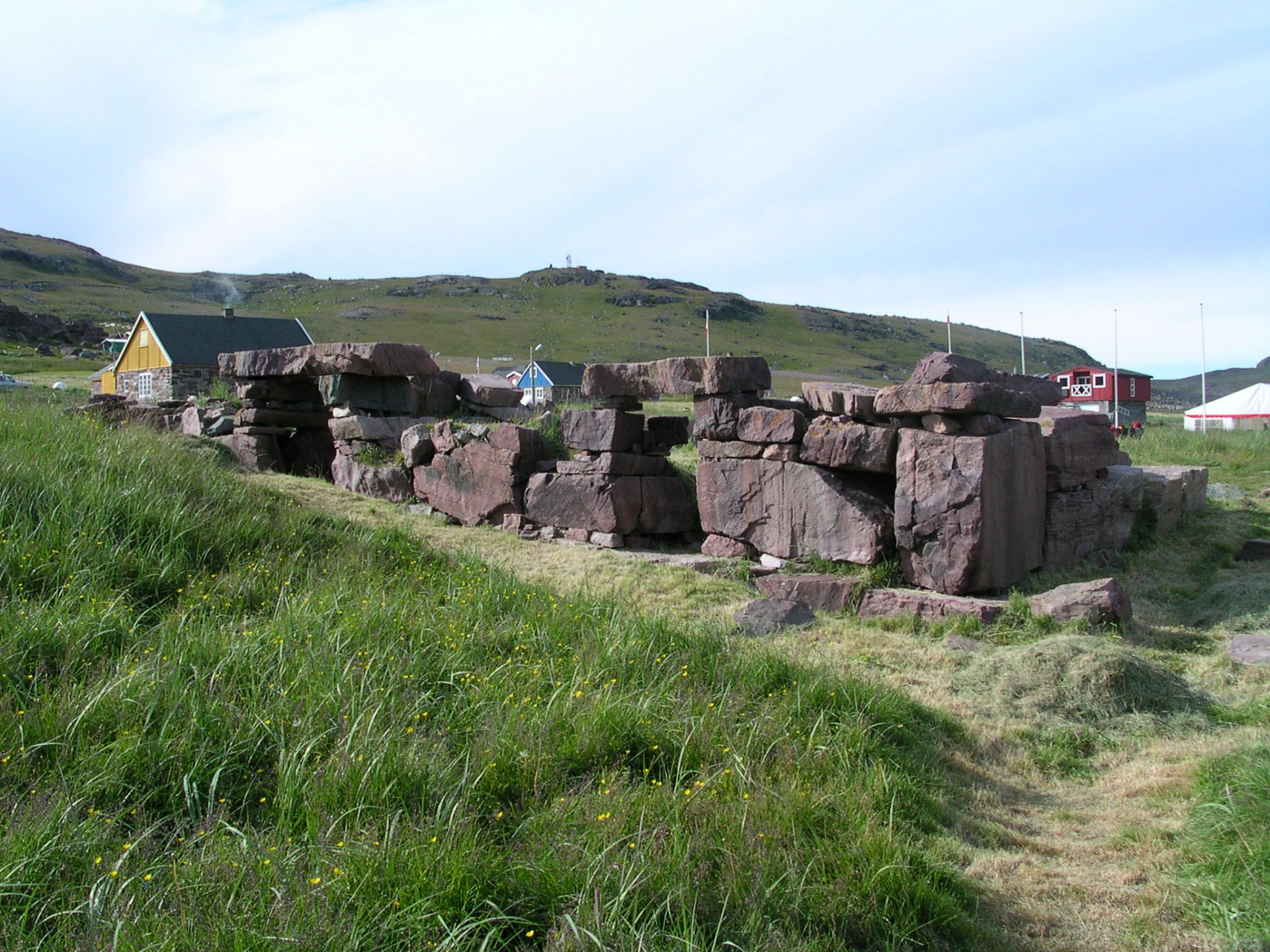 Ruinene av katedralen i Garðar, Austbygda (Eystribyggð), Sør‑Grønland. Garðar var bispesetet for hele den norrøne kolonien og ble etablert på 1100‑tallet. Katedralen, som trolig ble bygget rundt år 1125–1150, var den største kirken nordboerne reiste på Grønland, med tykke steinmurer og et imponerende anlegg som også omfattet store fjøs, prestegård og kirkegård. Herfra ble kirkelivet i både Austbygda og Vesterbygda styrt i flere hundre år. Etter at kontakten med Norge og Island sviktet på 1300‑tallet, ble Garðar gradvis forlatt, og anlegget lå øde da de siste nordboerne forsvant fra Grønland på 1400‑tallet.